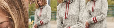 8674 Women’s Mélange Fleece Striped-Sleeve Hooded Sweatshirt