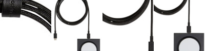 - Nylon braided cable, genuine leather belt, aluminum housed charging pad, non-slip silicone base